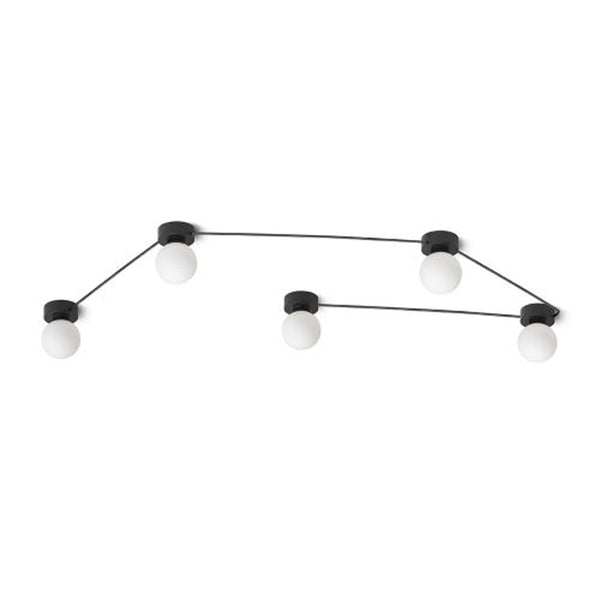 Stropne ali stenske svetilke s steklenimi senčniki na črno lakiranih podnožjih, povezane v vrsto s črnimi kabli. Napeljave lahko razporedite v skupine po vaši domišljiji. Primerno za LED svetlobne vire z G9 osnovo.