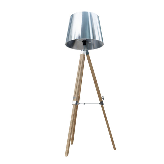 Stoječa svetilka s senčnikom iz kromirane folije. Ima po različici nastavljivo podlago iz bambusa. Primerno za svetlobne vire LED E27.