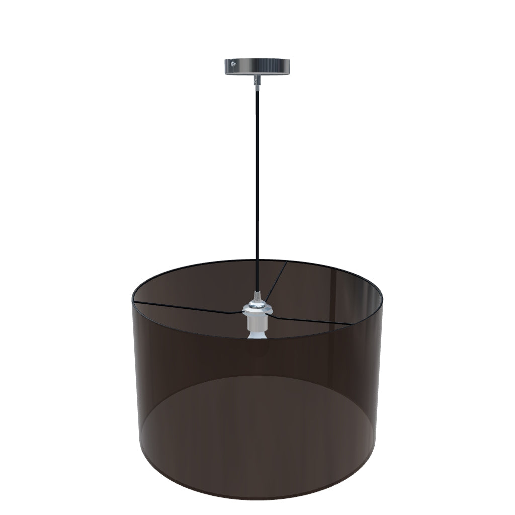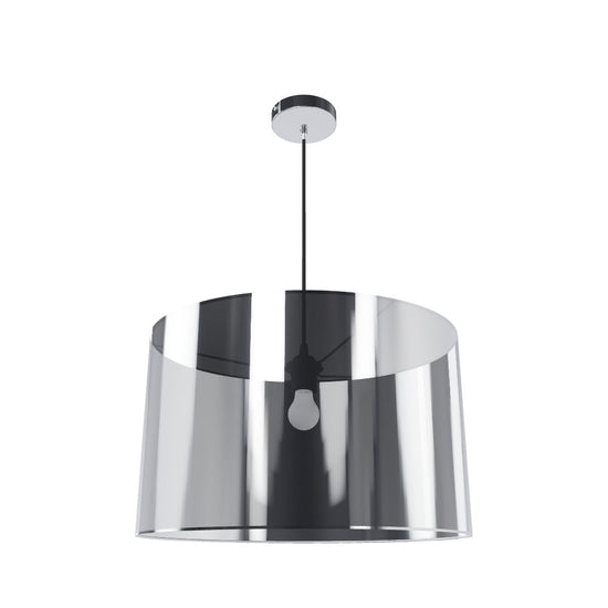 Okrasna viseča svetilka s kromiranim senčnikom.Površina senčnika je deloma transparentna, ko je svetilka prižgana in zrcalna, ko je svetilka ugasnjena.