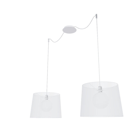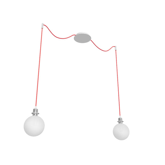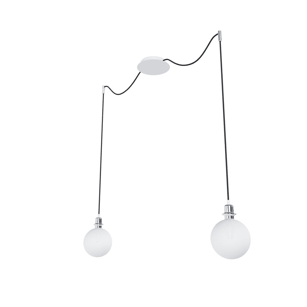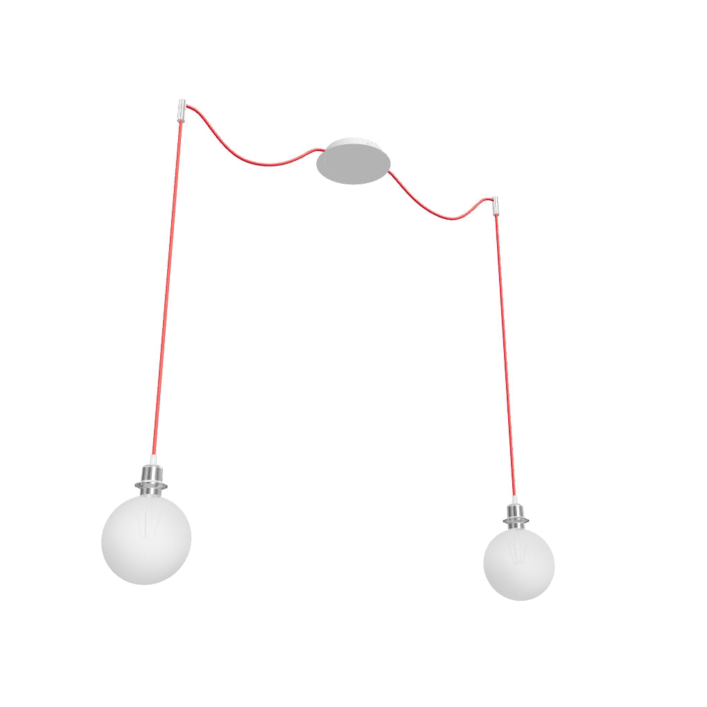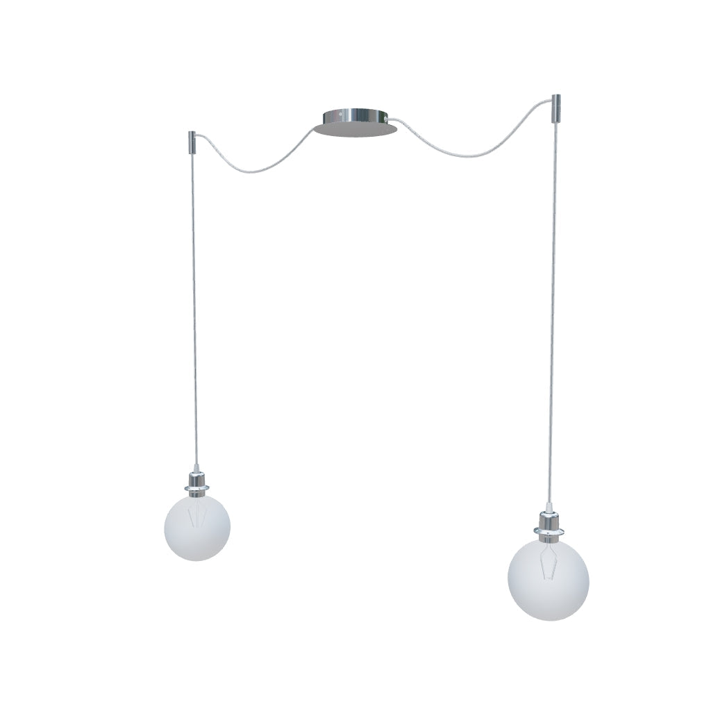 Viseča svetilka z osrednjo stropno osnovo in dvema individualnima tekstilnima kabloma s kovinskima E27 grloma. Primerno za okrasne sijalke ali ustrezne tekstilne senčnike. Kabla sta opremljena s kromiranima stropnima držaloma, ki ju lahko montirate v željeni oddaljenosti od osnove. Dolžina posameznega kabla je 3 m. Primerni senčniki: ARISTA, DELI, JAKARANDA, DOUBLE 40/30, DOUBLE 55/30, ASPRO 40/30, ASPRO 55/30, RON 15/20, RON 40/25, RON 55/30, TEMPO 15/30, TEMPO 30/19.
