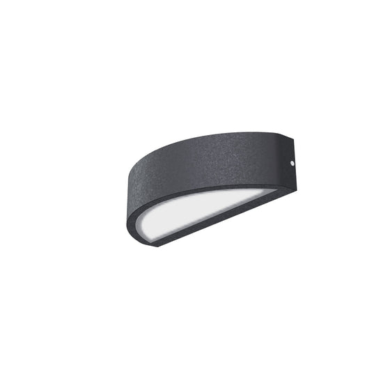 Zunanja stenska svetilka iz litega aluminija na voljo v treh barvnih različicah. Vključen kovinski pokrov za razsvetljavo usmerjeno navzdol.