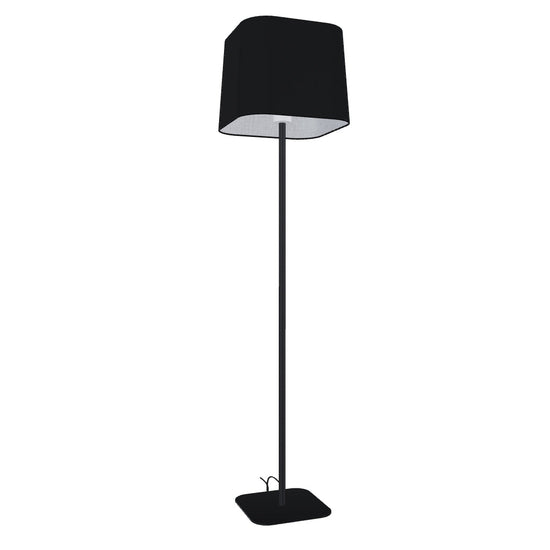 Stoječa svetilka s kotnim tekstilnim senčilom in kovinsko podlago.