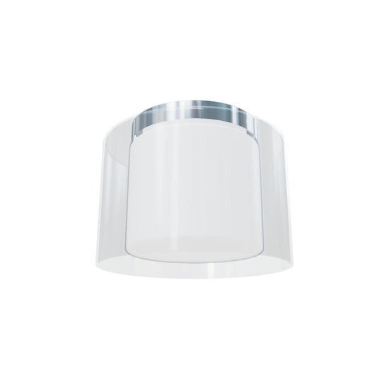 Stropna svetilka s kombiniranim senčilom, sestavljena iz zunanjega prozornega stekla in notranjega stekla v opalovi barvi, na kromirani podlagi z vtičnico E27 za LED vire svetlobe. Primerno za uporabo v kopalnicah.