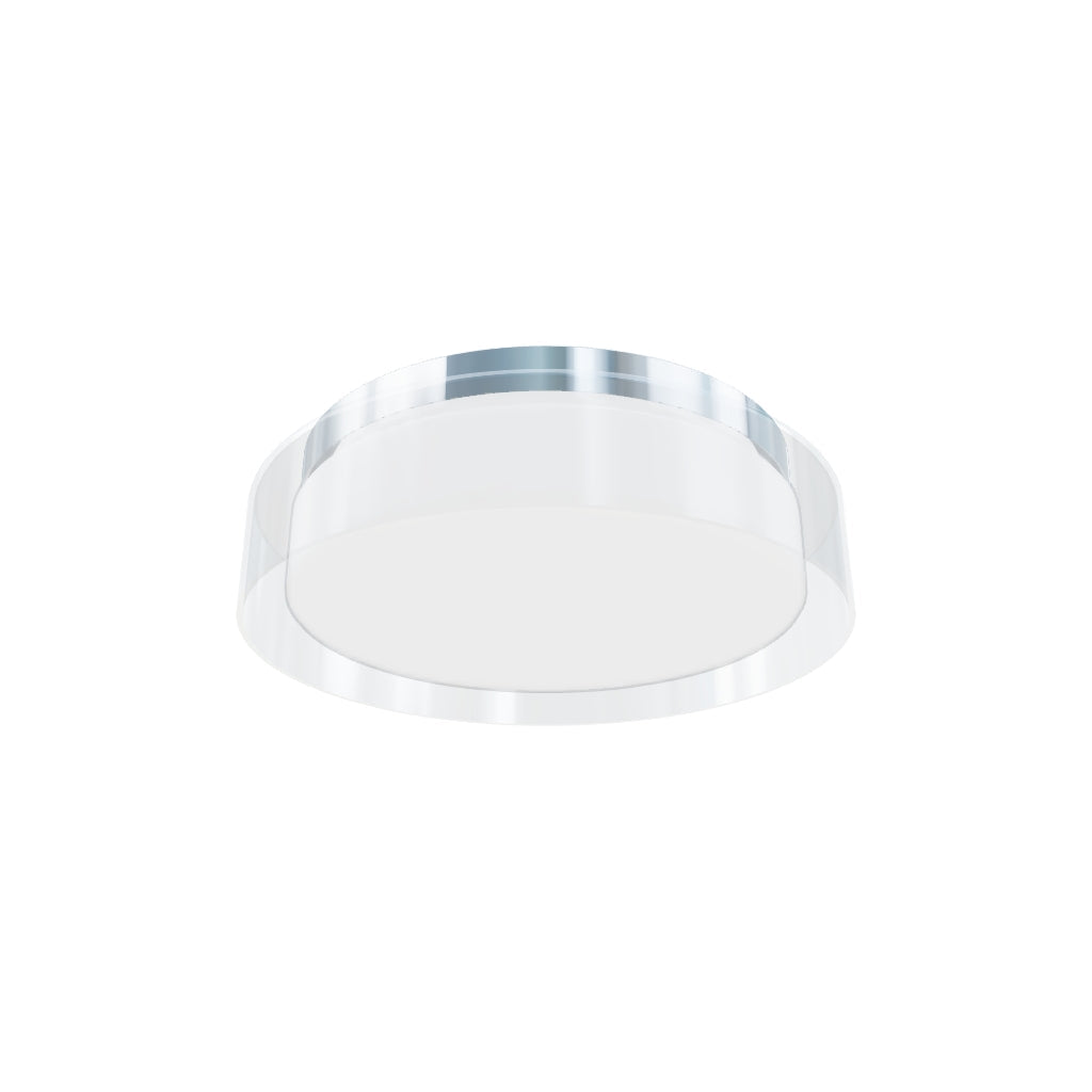 Stropna svetilka s kombiniranim senčnikom iz zunanjega prozornega stekla in notranjega opalnega stekla, ki je nameščena na kromiranem podstavku in z vgrajeno LED. Primerno za uporabo v kopalnicah.